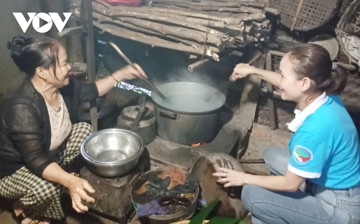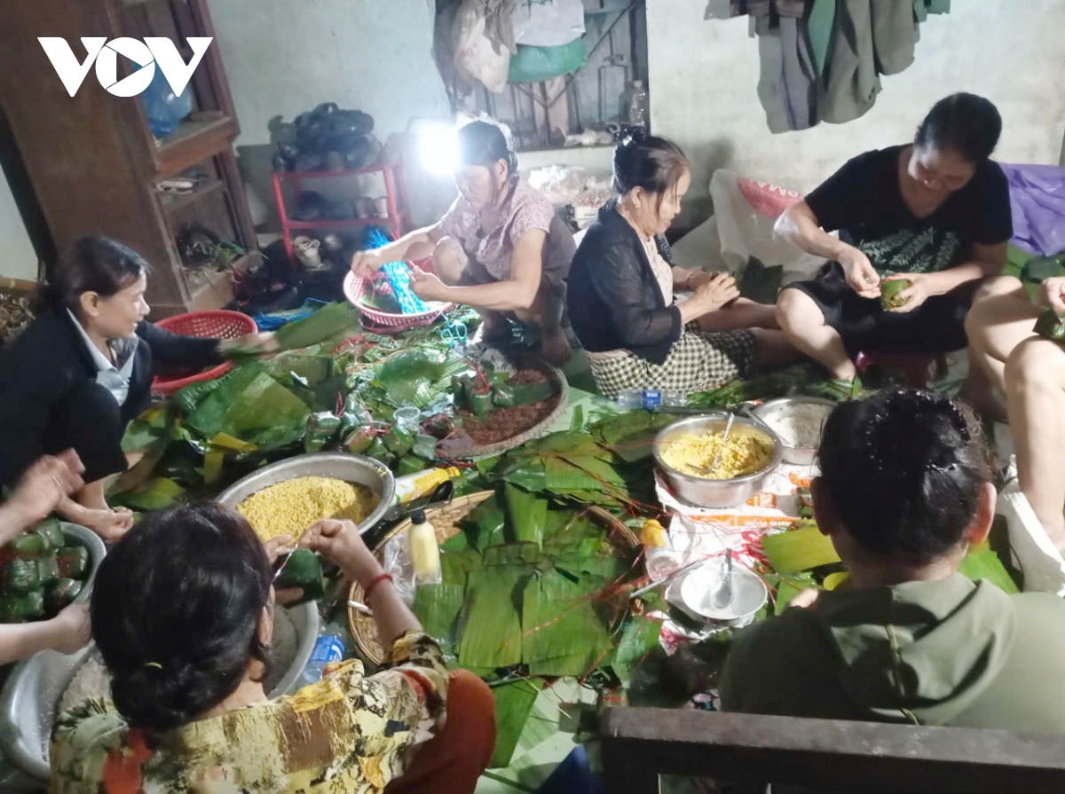 Phụ nữ xã Hiệp Đức (huyện Hiệp Đức cũ) gói bánh chưng hỗ trợ người dân vùng lũ.