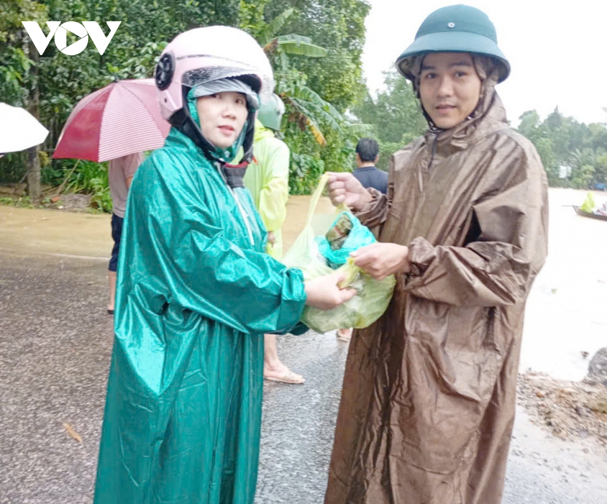 Bà Võ Thị Giang Như, Phó Chủ tịch Hội Liên hiệp phụ nữ xã Hiệp Đức (trái) trao bánh chưng đến người sơ tán tránh lũ