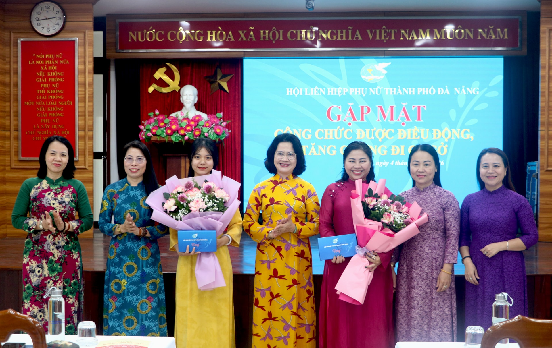 Chủ tịch Hội Liên hiệp Phụ nữ thành phố Đà Nẵng Hoàng Thị Thu Hương (thứ 4, bên phải sang) tặng hoa, động viên cán bộ nữ được điều động, tăng cường đi cơ sở. Ảnh: HOÀNG CƯỜNG