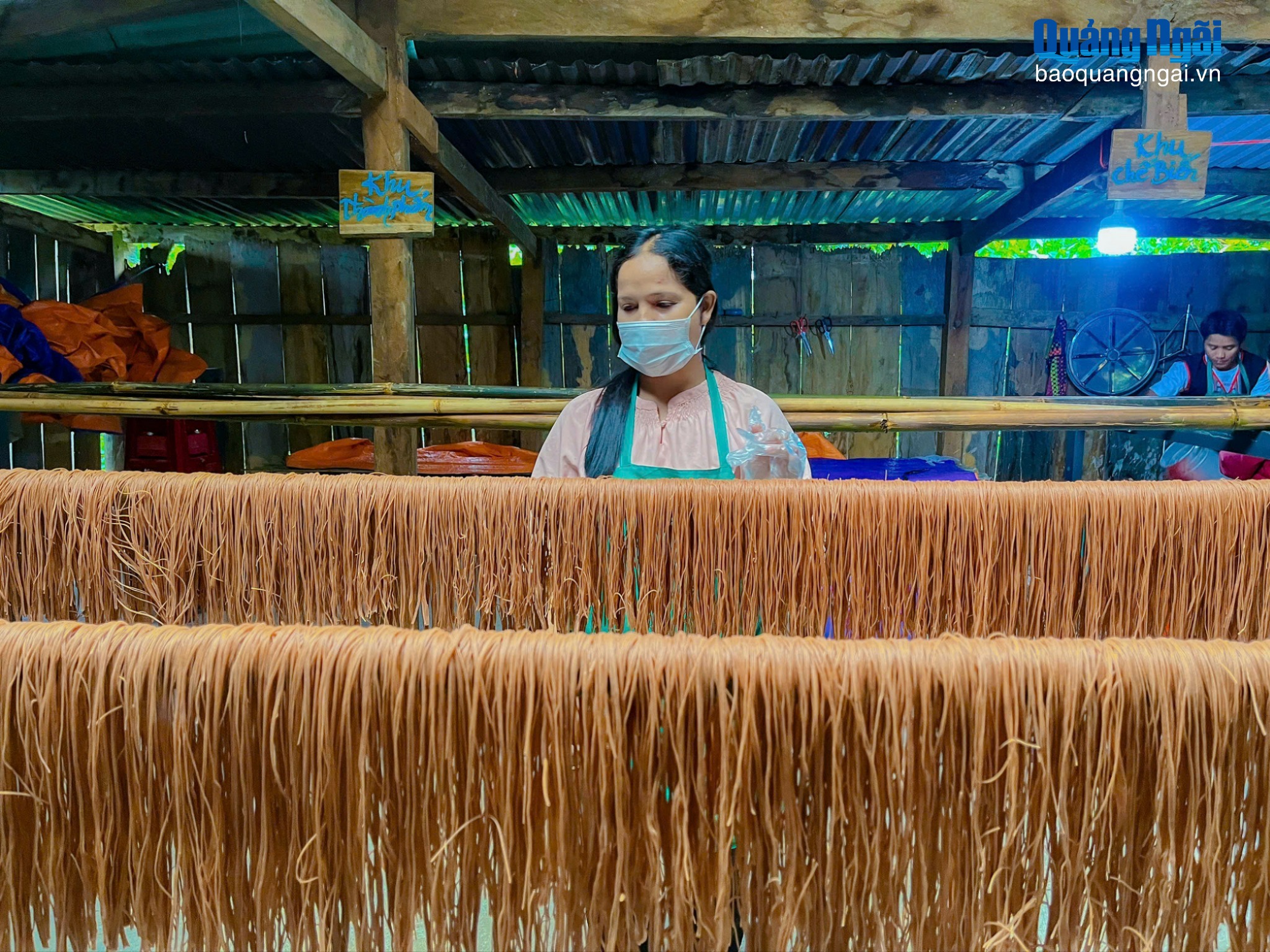 Chị Y Siêu đang phơi những sợi bún gạo đỏ. Ảnh: ĐÔ ĐÔ