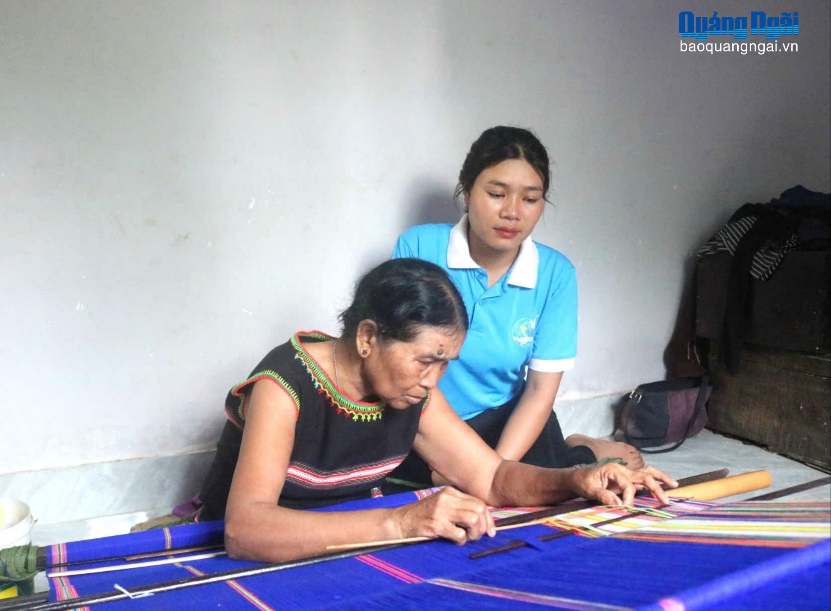 Chị Y Tuen chăm chú quan sát nghệ nhân trong tổ hợp tác hướng dẫn dệt các hoa văn khó.