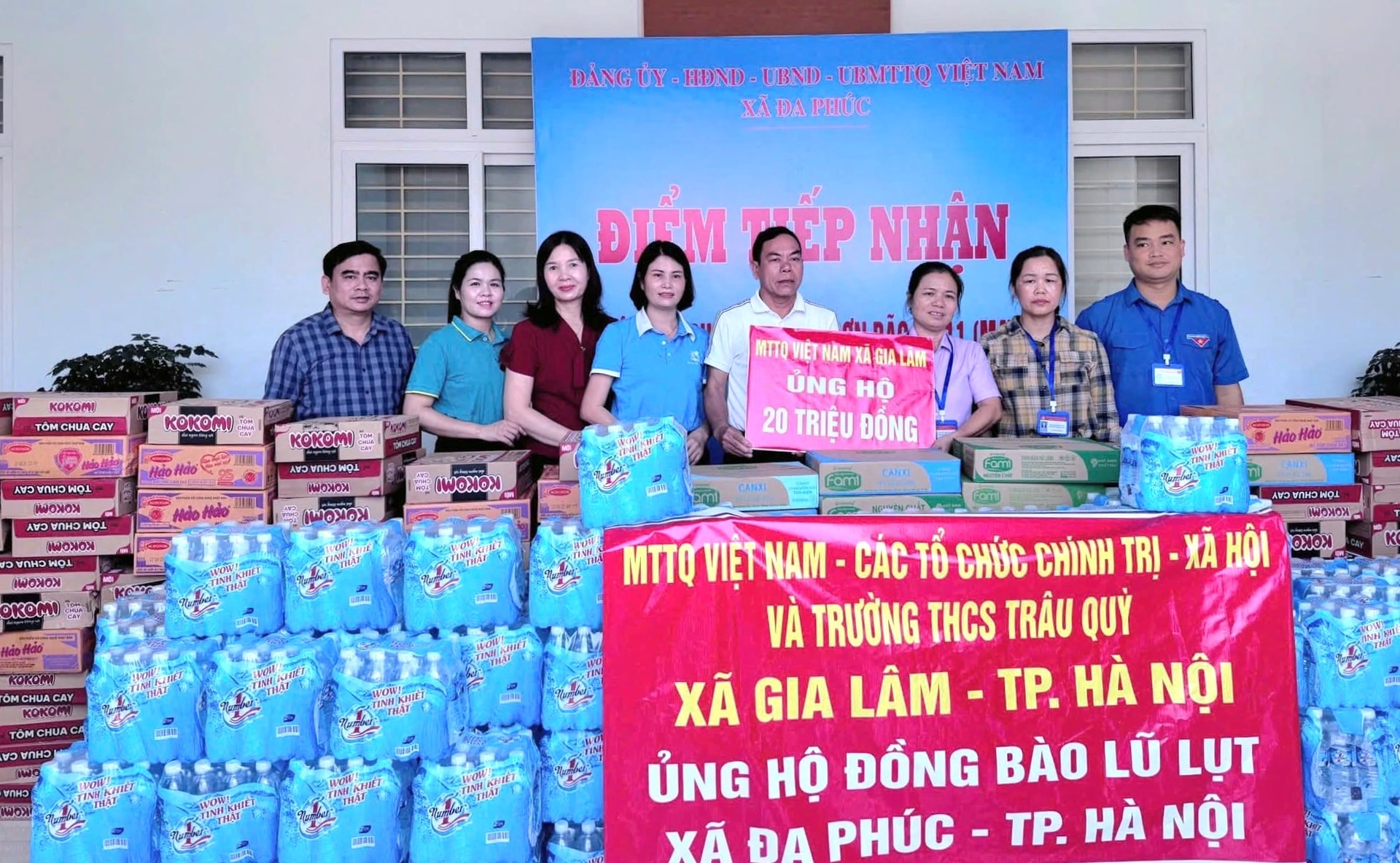 Hội Liên hiệp phu nữ xã Gia Lâm cùng MTTQ xã và các đoàn thể tham gia ủng hộ đồng bào bị bão lụt. Ảnh: Hoàng Nga