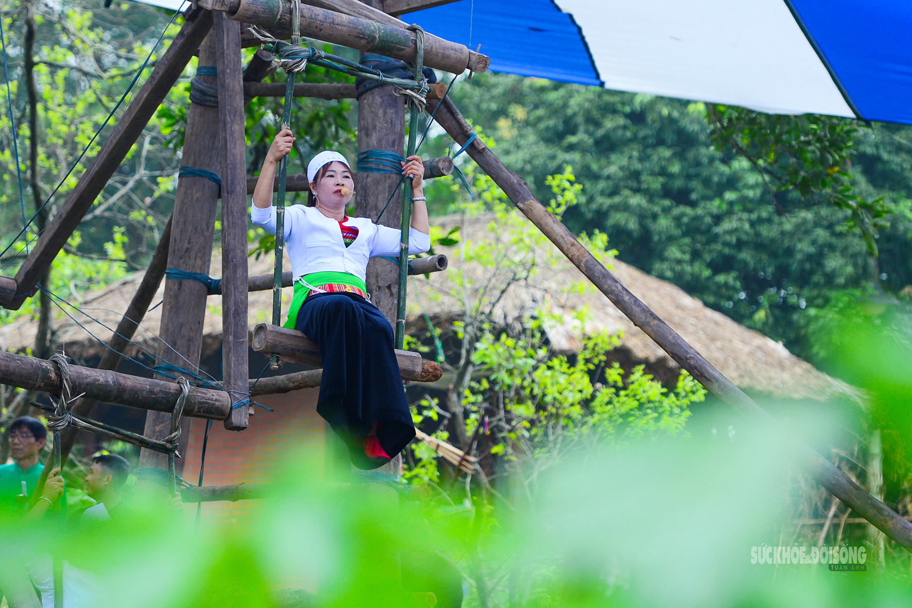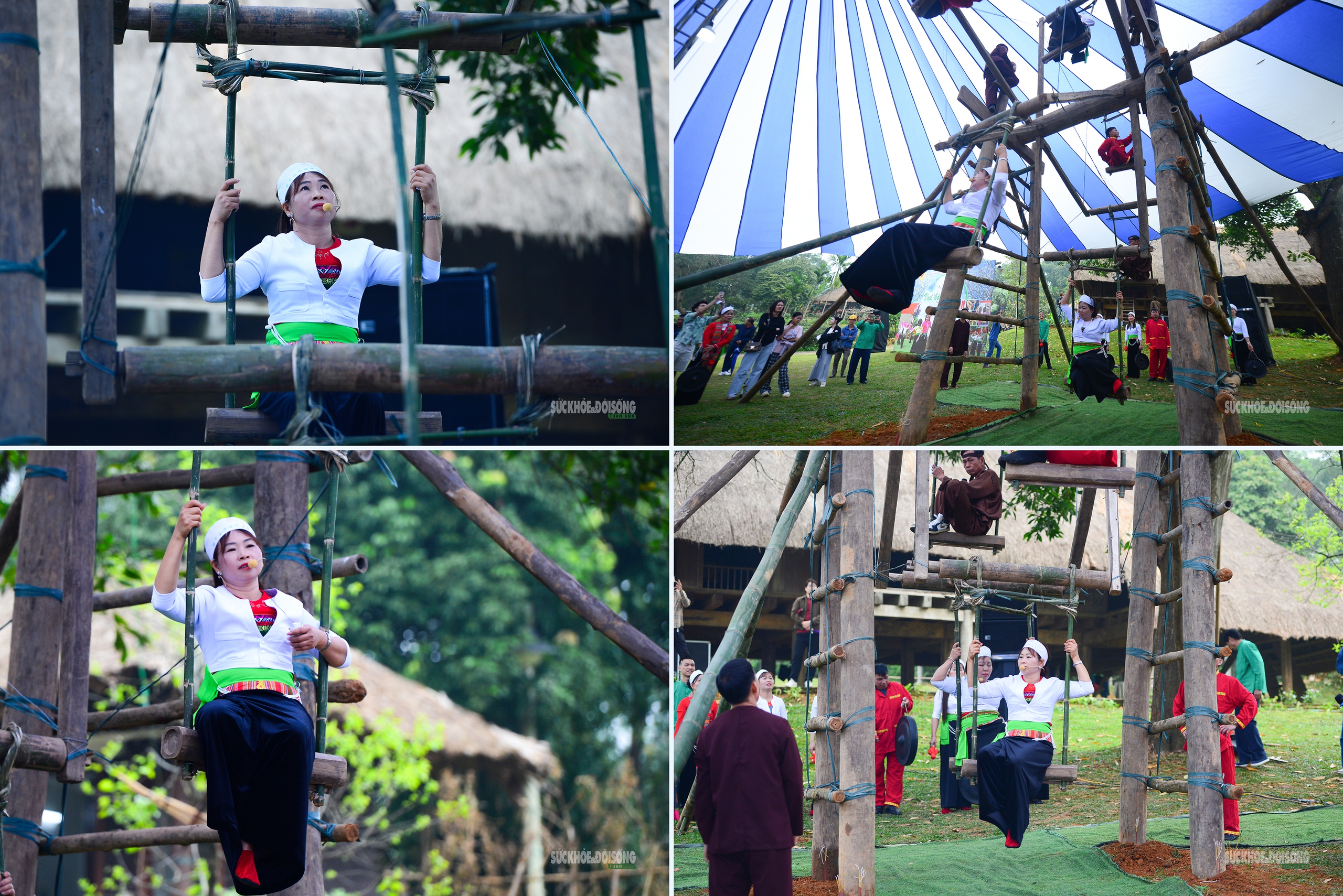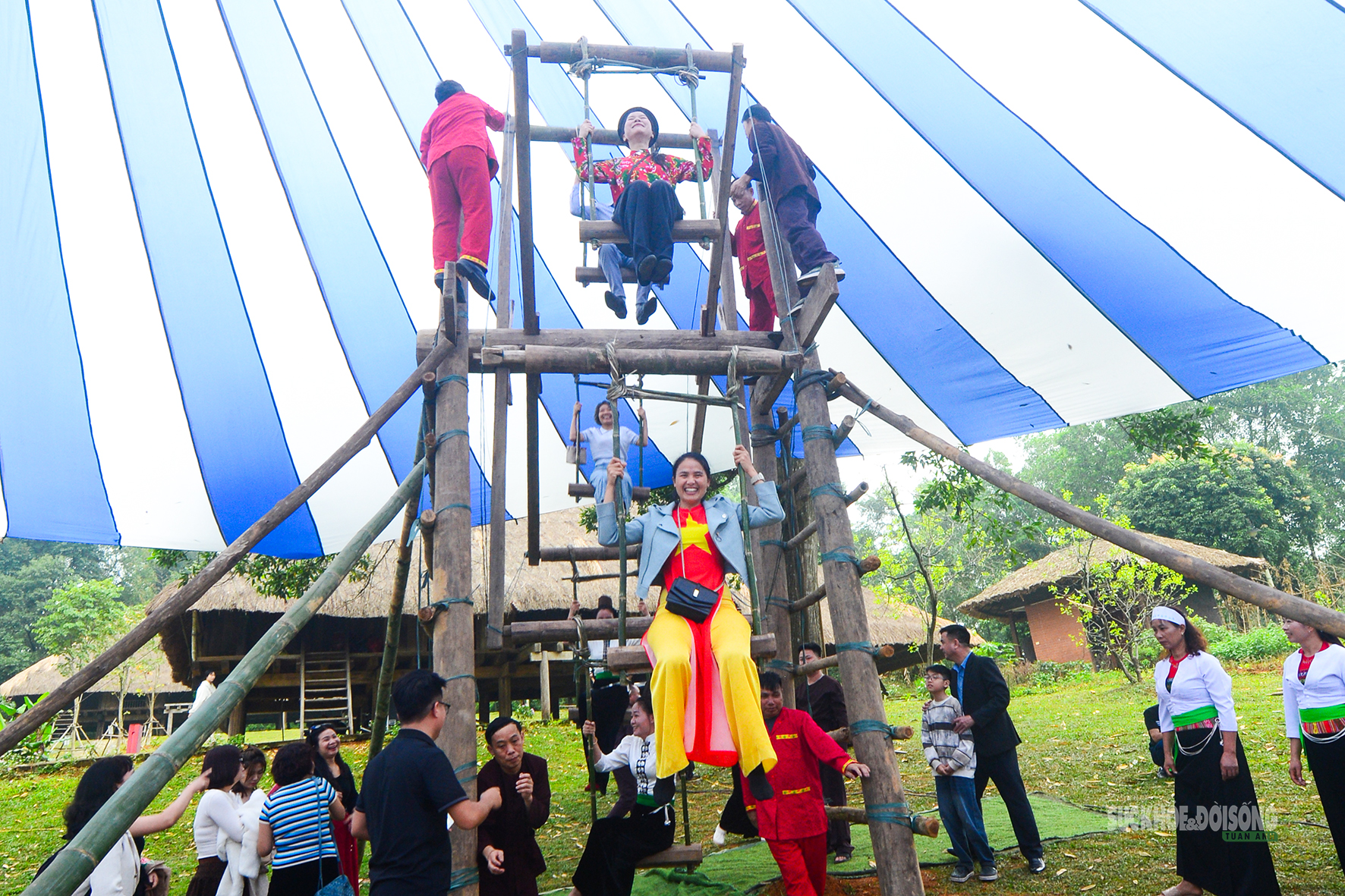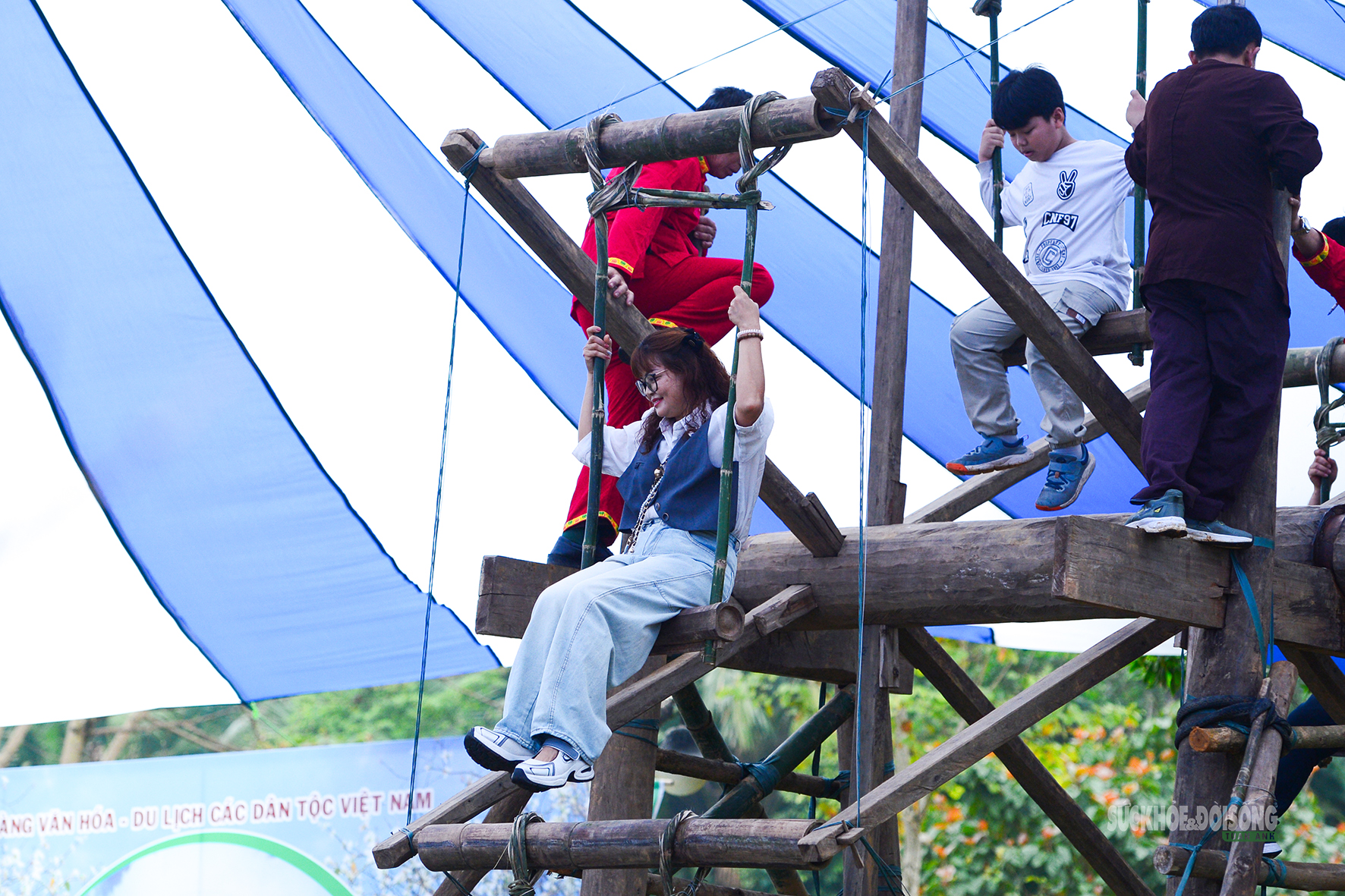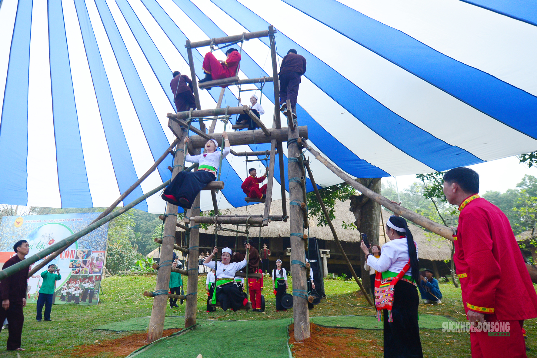 Phụ nữ Mường hào hứng trên cây đu khổng lồ giữa Làng Văn hóa.