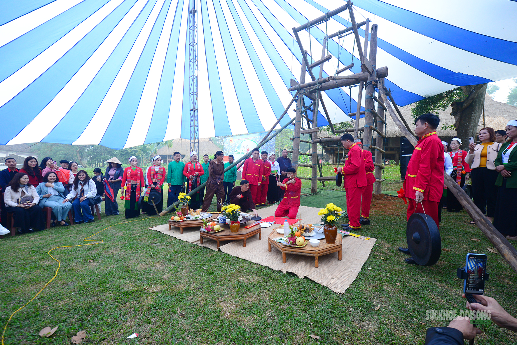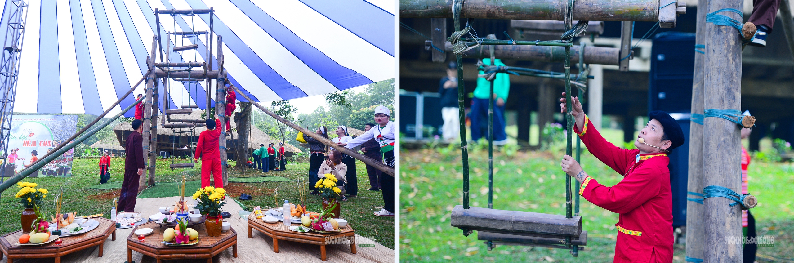 Giữa không gian nhà sàn, tiếng cồng chiêng và trang phục truyền thống, cây đu lớn trở thành tâm điểm của ngày hội. Trong tiếng hát và lời cổ vũ rộn ràng, phụ nữ Mường lần lượt bước lên cây đu, tái hiện sinh động trò vui dân gian gắn với lễ hội đầu xuân.