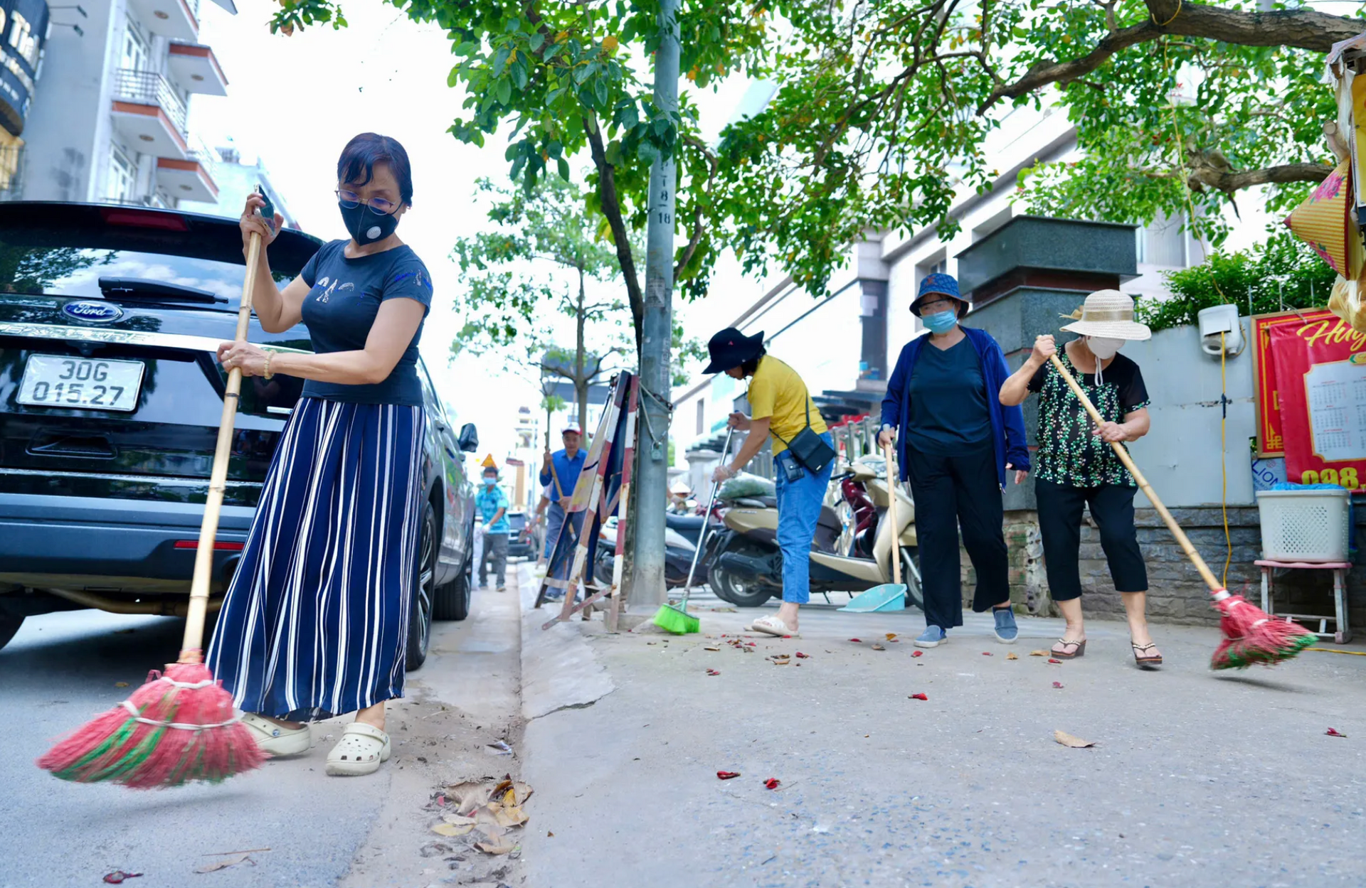 Hội viên phụ nữ phường Phú Thượng tham gia dọn dẹp vệ sinh môi trường ngày cuối tuần. Ảnh: PV
