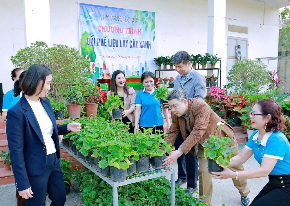 Những chậu hoa, cây xanh được trao cho người dân đổi phế liệu.