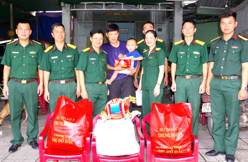 Cán bộ Hội Phụ nữ Trung đoàn 4, Sư đoàn 5 (Quân khu 7) và các đại biểu tặng quà bé Lê Chí Đại ở ấp Thanh Đông, phường Thanh Điền (Tây Ninh). Ảnh: KIM OANH