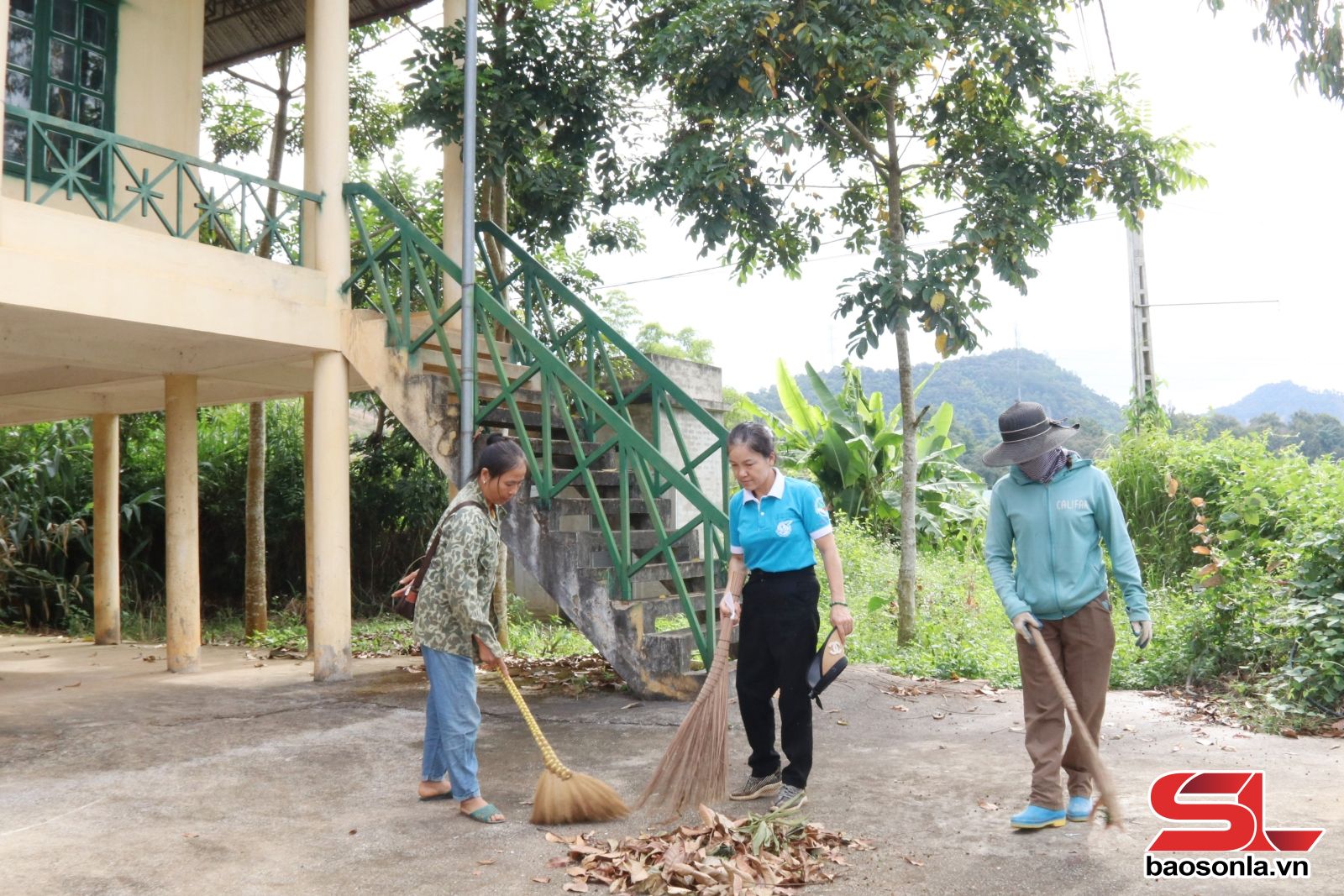 Hội viên phụ nữ tiểu khu 8, xã Tà Hộc dọn vệ sinh nhà văn hóa.