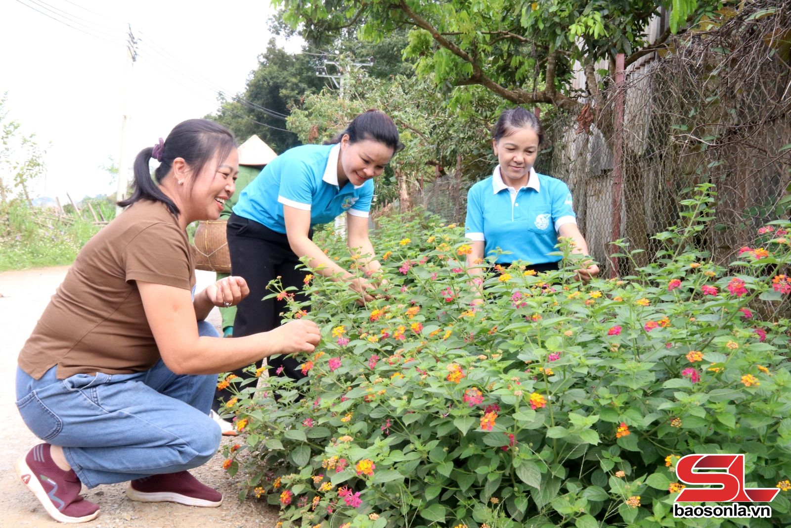 Phụ nữ xã Tà Hộc chăm sóc tuyến đường hoa.