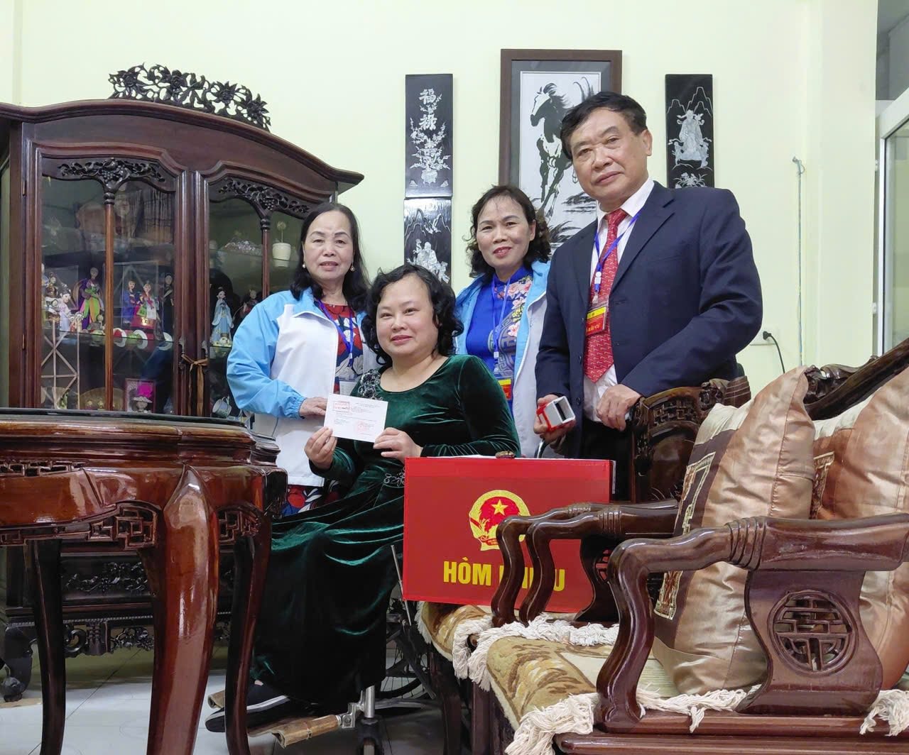 Phụ nữ phường Ngọc Hà phối hợp đưa hòm phiếu lưu động đến tận nhà cho cử tri khuyết tật, người già yếu gặp khó khăn trong đi lại bỏ phiếu sớm. Ảnh: PV
