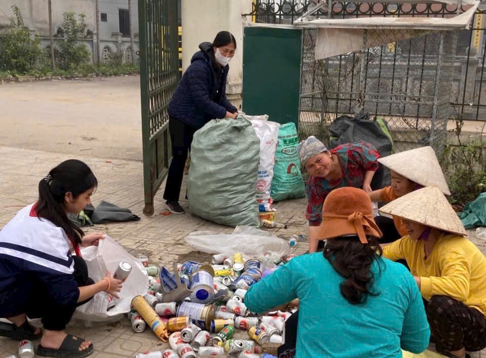 Phụ nữ xã Hồng Vân thu gom phế liệu gây quỹ an sinh để tặng quà cho phụ nữ và trẻ em khó khăn trong dịp Tết. Ảnh: PV