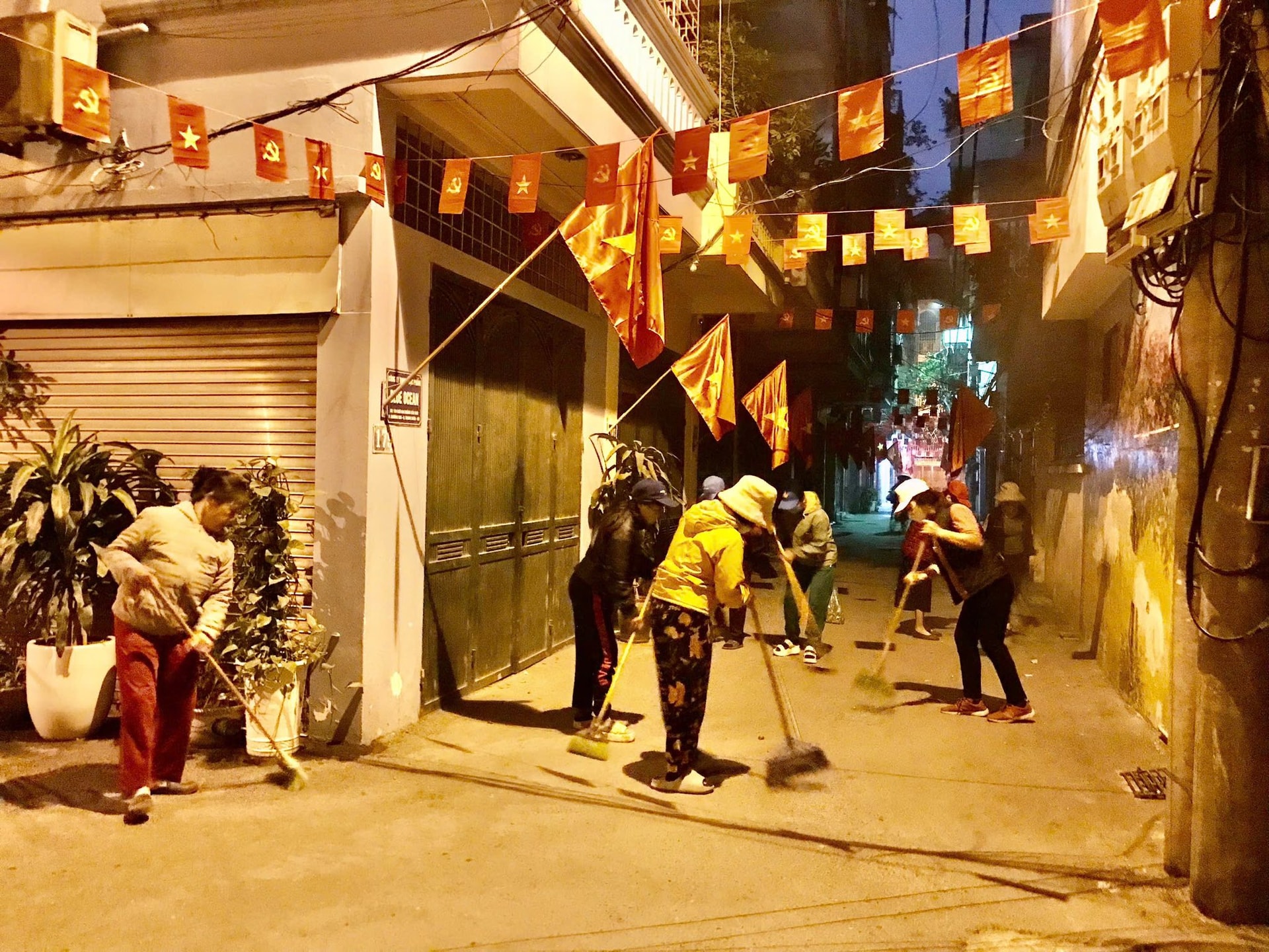Phụ nữ phường Phương Liệt dọn dẹp phố phường từ sáng sớm để chuẩn bị đón Tết. Ảnh: PV