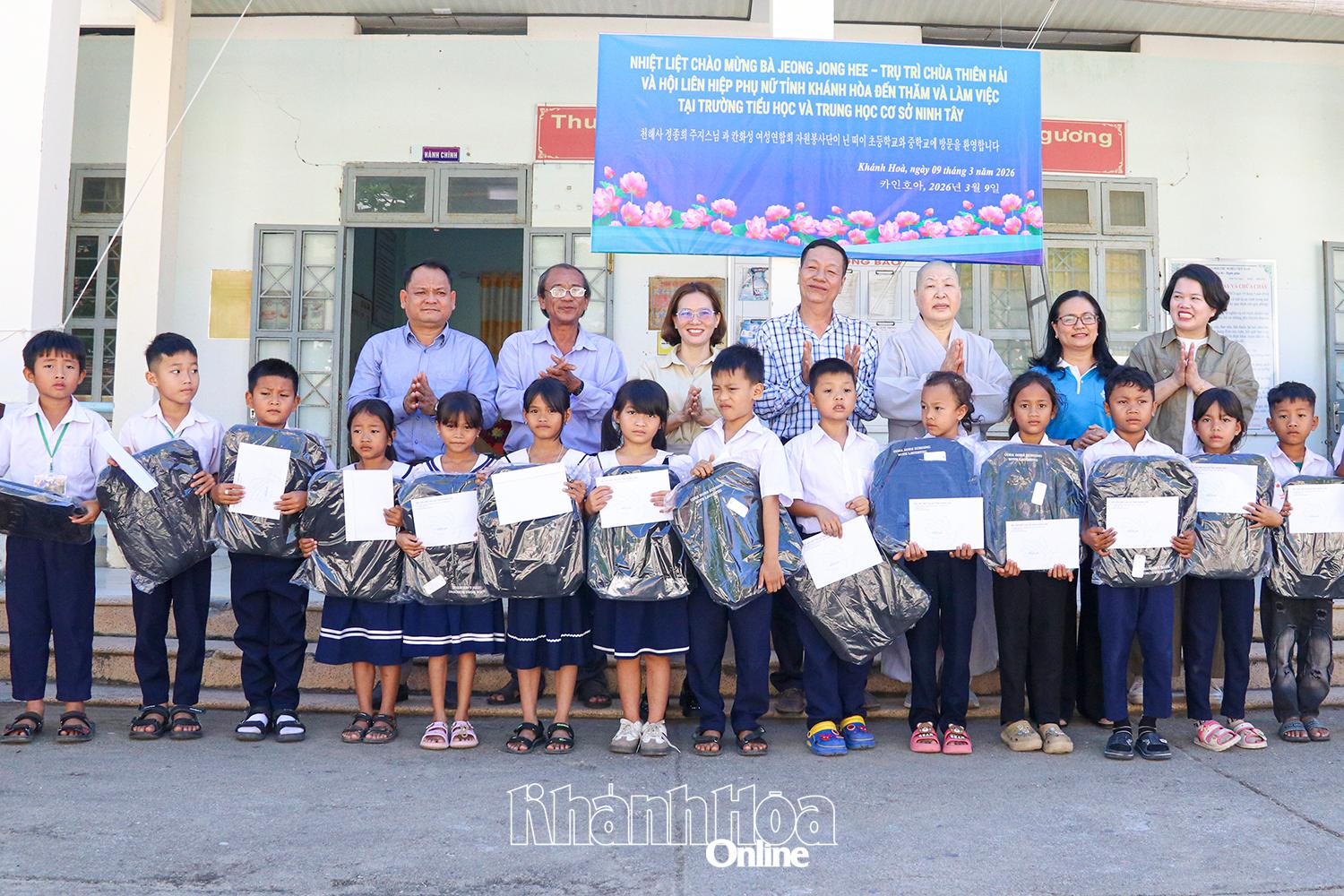 Lãnh đạo Hội Liên hiệp Phụ nữ tỉnh và đoàn thiện nguyện chùa Thiên Hải tặng học bổng và quà cho học sinh Trường Tiểu học và THCS Ninh Tây.