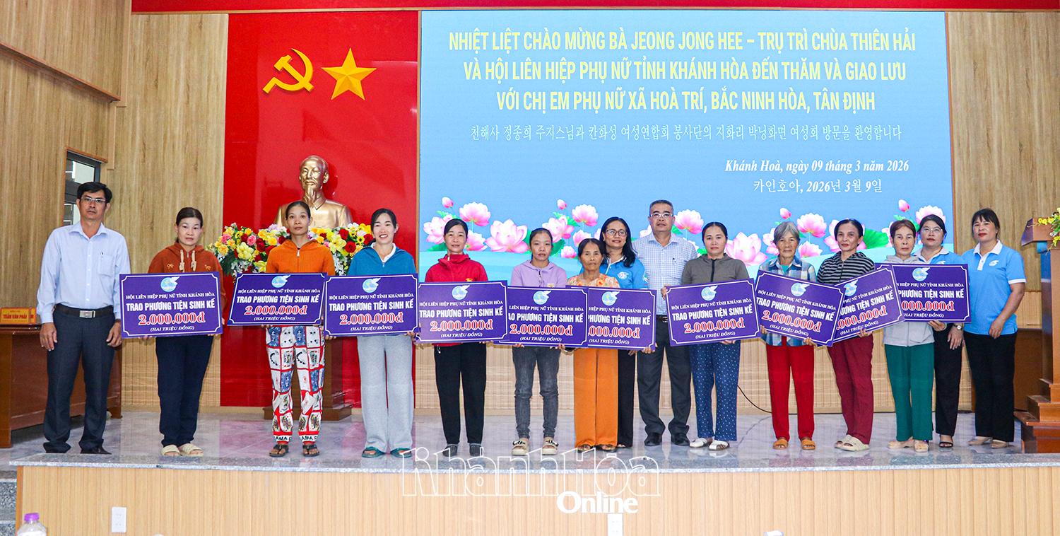 Bên cạnh đó, đoàn đã trao 25 phương tiện sinh kế (2 triệu đồng/suất), cùng quà cho hội viên phụ nữ có hoàn cảnh khó khăn tại các xã: Bắc Ninh Hòa, Tân Định và Hòa Trí, góp phần giúp các chị em có thêm điều kiện phát triển kinh tế gia đình. Chị Trần Thị Ánh Thi (xã Bắc Ninh Hòa) cho biết: "Được nhận hỗ trợ sinh kế, tôi rất mừng và sẽ dùng số tiền này mua máy móc, nguyên liệu để nhận gia công quần áo tại nhà, cải thiện thu nhập".