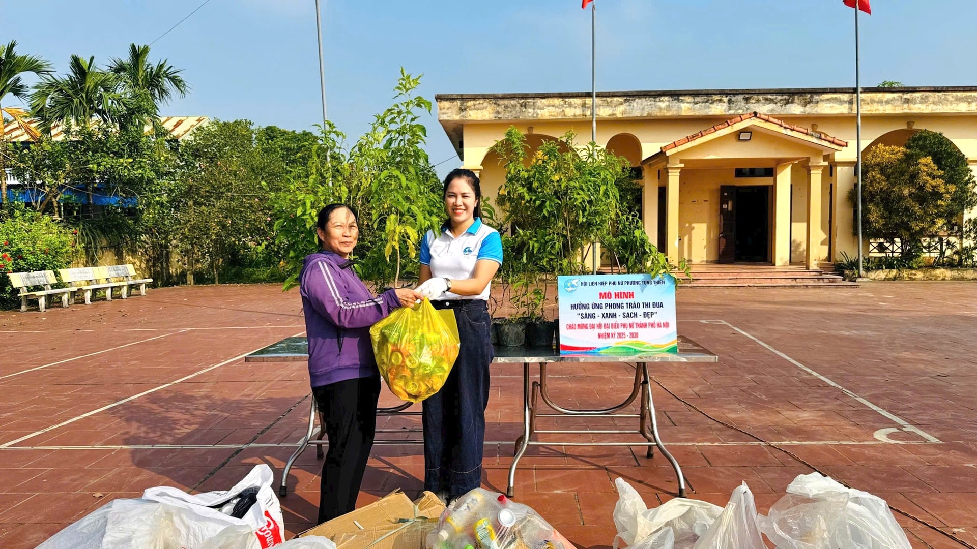 Các hội viên phụ nữ phường Tùng Thiện nhiệt tình tham gia, đóng góp từng bao phế liệu nhỏ, góp phần lan tỏa những thông điệp ý nghĩa, thiết thực: “Mỗi hành động nhỏ - một ý nghĩa lớn vì cộng đồng xanh, sạch, đẹp", "Mỗi cây xanh được trao đi - một hành động đẹp được lan tỏa". "Bảo vệ môi trường - sống xanh - sống đẹp".