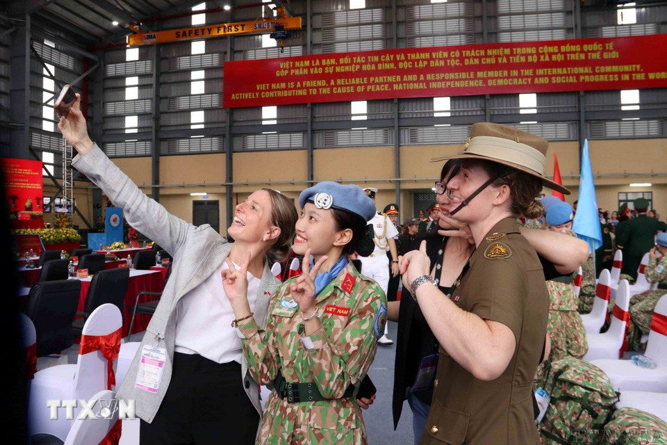 Các nữ chiến sỹ Bệnh viện cấp 2 số 7 bên những người bạn quốc tế tại Lễ xuất quân Bệnh viện dã chiến cấp 2 số 7 và Đội Công binh số 4 lên đường thực hiện nhiệm vụ gìn giữ hòa bình của Liên hợp quốc tại Phái bộ gìn giữ hòa bình của Liên hợp quốc tại Nam Sudan (Phái bộ UNMISS) và Khu vực Abyei (Phái bộ UNISFA). (Ảnh: Xuân Khu/TTXVN)