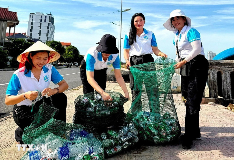 Hội viên, phụ nữ Hội Liên hiệp phụ nữ xã Bảo Ninh (cũ) nay thuộc Hội Liên hiệp phụ nữ phường Đồng Hới (Quảng Trị) thu gom, phân loại, bán phế liệu đóng góp xây dựng quỹ tình thương. (Ảnh: TTXVN phát)