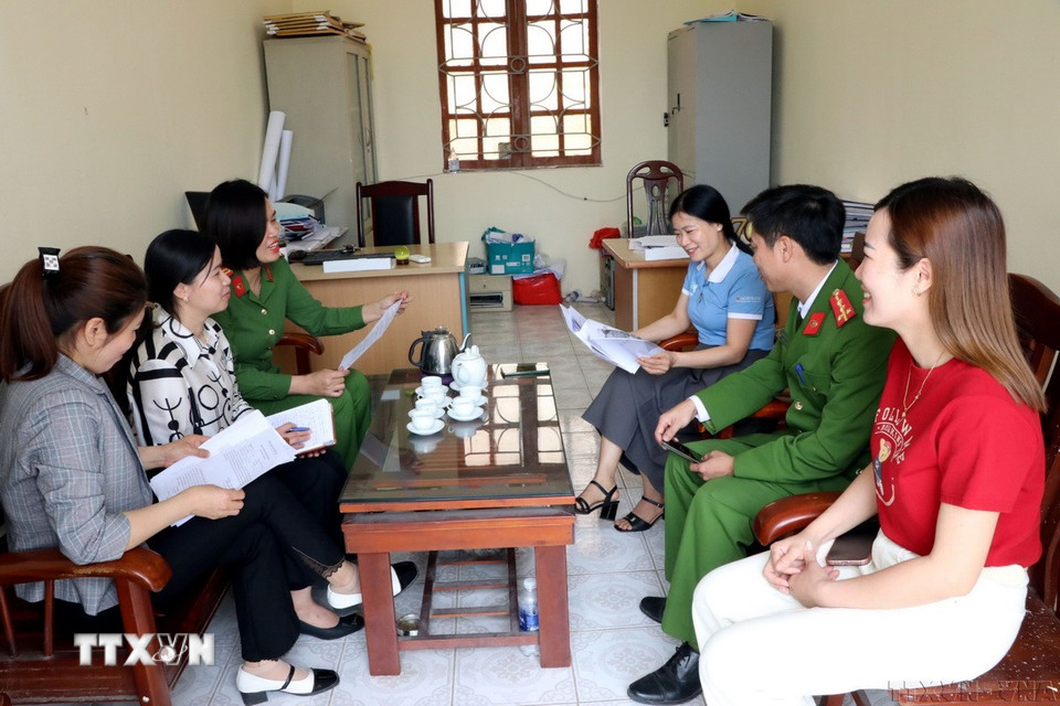 Hội phụ nữ thị xã Kinh Môn phối hợp với lực lượng công an chuẩn bị các nội dung tuyên truyền cho phụ nữ về các cách thức mà các đối tượng hay sử dụng để lừa đảo trên mạng. (Ảnh: Mạnh Tú/TTXVN)