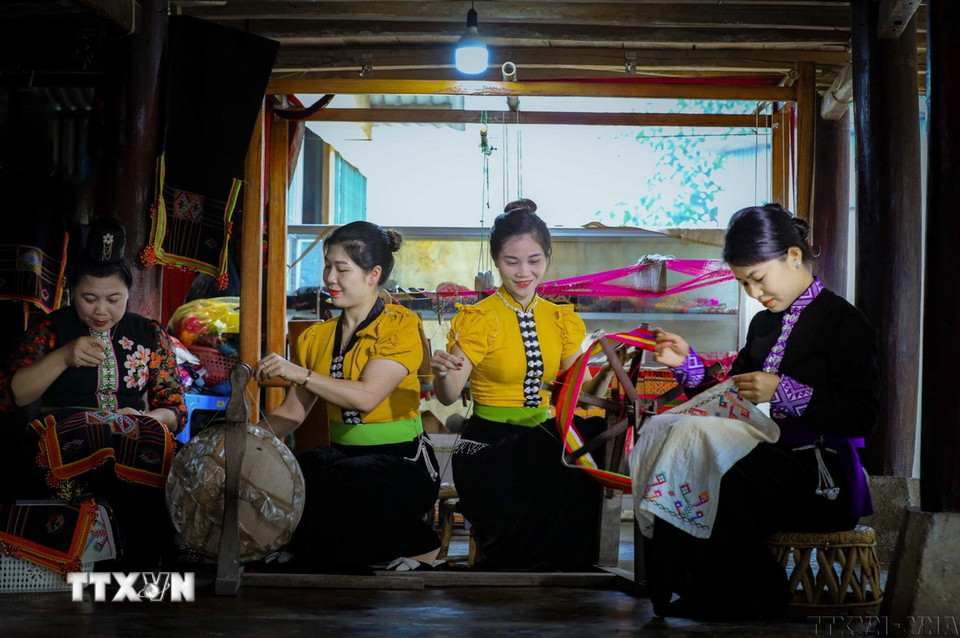 Những phụ nữ dân tộc Thái vẫn bền bỉ truyền nghề cho thế hệ trẻ từng họa tiết, hoa văn đặc trưng mang đậm bản sắc văn hóa dân tộc. (Ảnh: Xuân Tư/TTXVN)