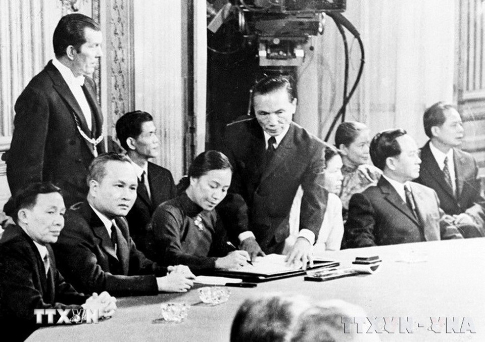 Bà Nguyễn Thị Bình, Bộ trưởng Bộ Ngoại giao Chính phủ cách mạng lâm thời Cộng hòa miền Nam Việt Nam đặt bút ký Hiệp định Paris về chấm dứt chiến tranh, lập lại hòa bình ở Việt Nam. (Ảnh: Tư liệu TTXVN)