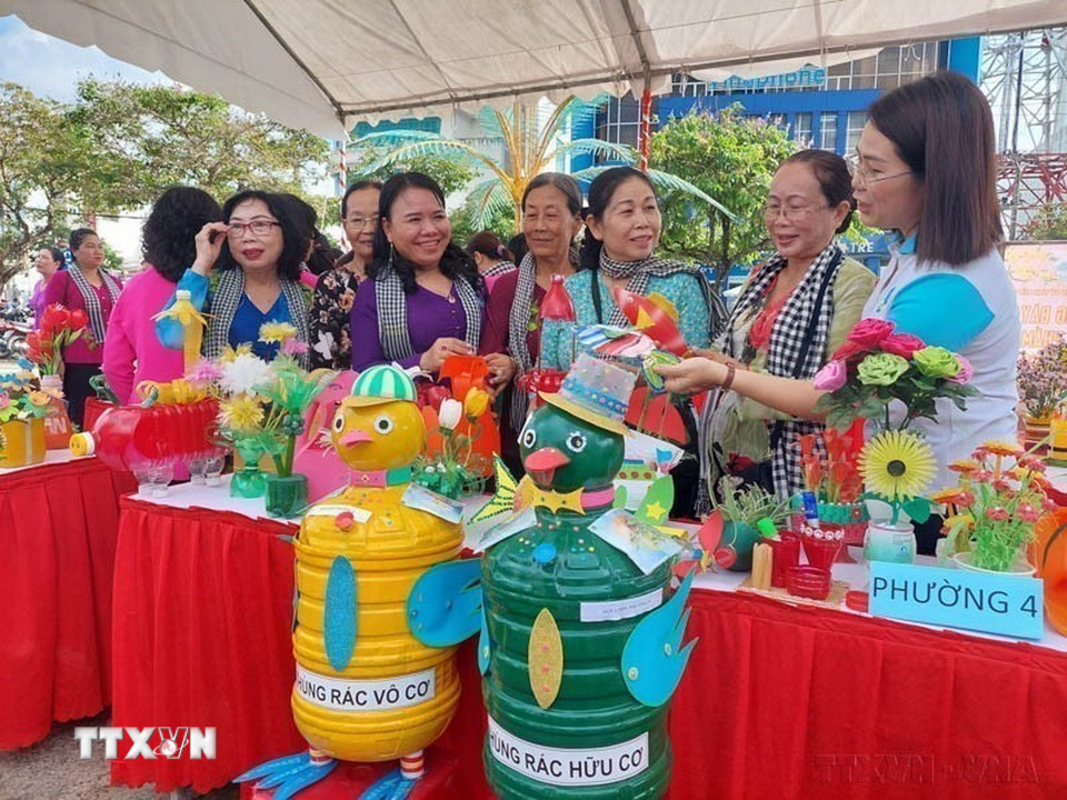 Thực tế chứng minh, bằng tài năng, trí tuệ và nhiệt huyết, phụ nữ đã tham gia vào các lĩnh vực của đời sống xã hội, đóng góp vào công cuộc đổi mới, phát triển đất nước. Trong ảnh: Phụ nữ Bến Tre khéo léo biến rác thải nhựa thành nhiều sản phẩm hữu dụng. (Ảnh: Chương Đài/ TTXVN)