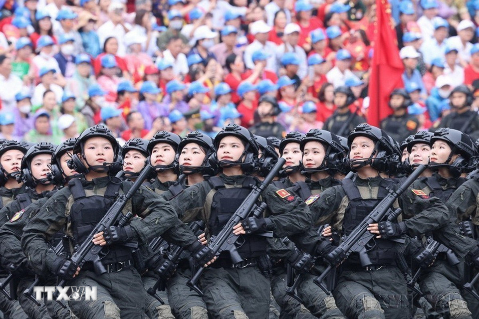 Nữ chiến sỹ Cảnh sát đặc nhiệm tham gia diễu binh tại Lễ kỷ niệm 70 năm Chiến thắng lịch sử Điện Biên Phủ (7/5/1954-7/5/2024) được tổ chức trọng thể tại thành phố Điện Biên Phủ, tỉnh Điện Biên. (Ảnh: Lâm Khánh/TTXVN)