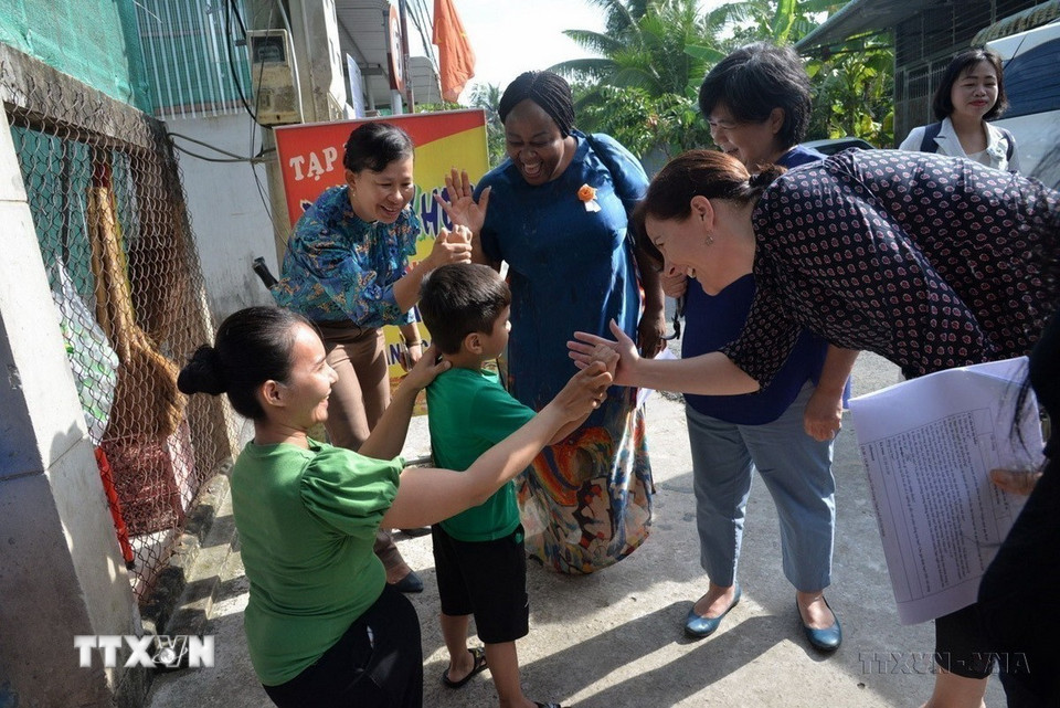 Đoàn công tác của Đại sứ quán Australia tại Việt Nam cùng Cơ quan Liên hợp quốc về Bình đẳng giới và Trao quyền cho phụ nữ (UN Women) đến Tiền Giang khảo sát thực tế kết quả thực hiện Dự án “Ứng phó khẩn cấp và hỗ trợ phục hồi cho phụ nữ có nguy cơ bị bạo lực bị ảnh hưởng nặng nề bởi làn sóng COVID-19 lần thứ tư ở Tiền Giang” (2023). (Ảnh: Hữu Chí/TTXVN)