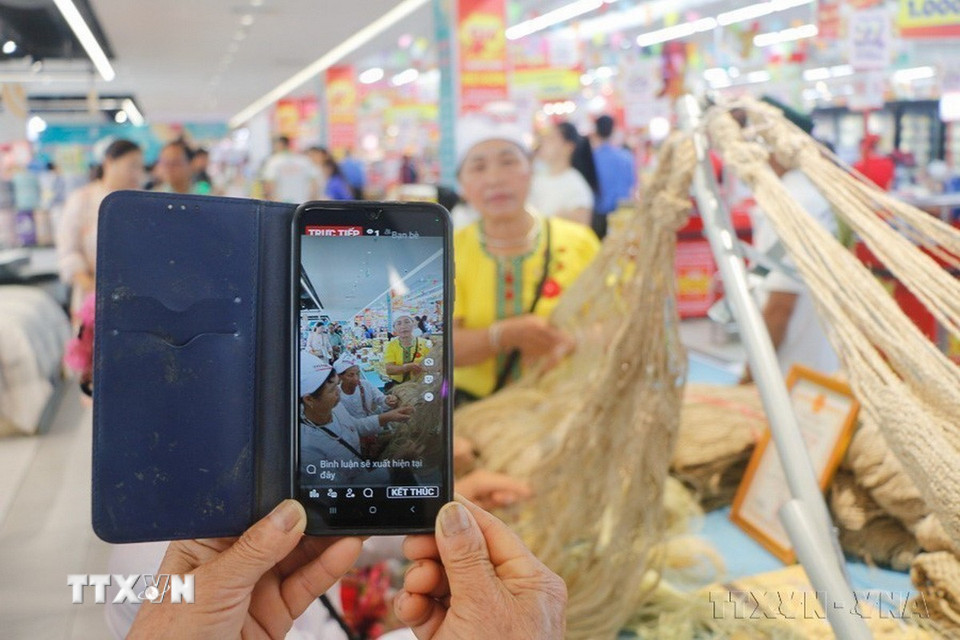 Thực tế chứng minh, bằng tài năng, trí tuệ và nhiệt huyết, phụ nữ đã tham gia vào các lĩnh vực của đời sống xã hội, đóng góp xứng đáng vào công cuộc đổi mới, phát triển đất nước. Trong ảnh: Livestream quảng bá sản phẩm OCOP võng gai truyền thống Nghệ An tại siêu thị Go!Vinh. (Ảnh: Bích Huệ/ TTXVN)