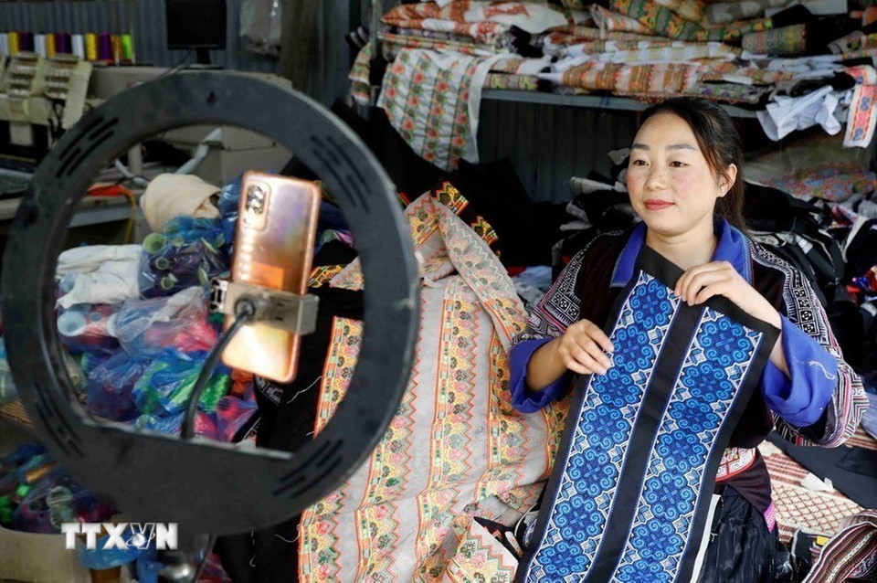 Chị Cứ Thị Dở, dân tộc Mông, huyện Mù Cang Chải, Yên Bái nhanh chóng tiếp cận công nghệ số, tiếp thị các sản phẩm vải thổ cẩm trên nền tảng mạng xã hội. (Ảnh: Trần Việt/TTXVN)