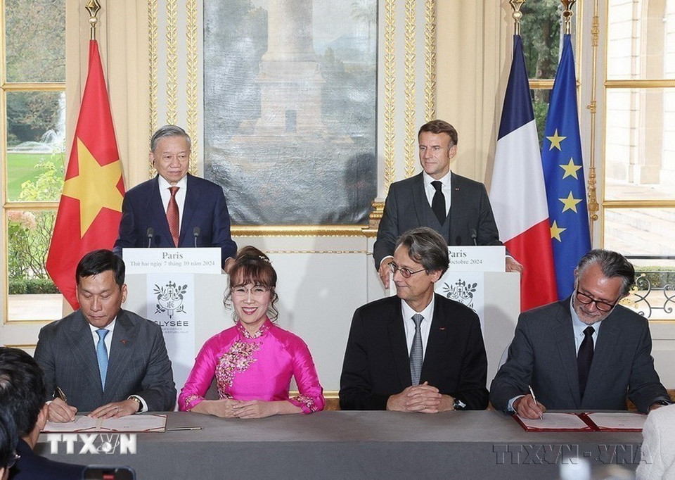 Chủ tịch Hội đồng Quản trị Công ty Cổ phần Hàng không VietjetAir Nguyễn Thị Phương Thảo cùng Tổng Giám đốc Đinh Việt Phương và Tổng giám đốc tập đoàn Safran Oliver Andrìes cùng Tổng Giám đốc CFM International Gael Méheust ký kết Hợp đồng cung cấp động cơ và dịch vụ bảo dưỡng động cơ cho 200 máy bay thân hẹp (7/10/2024). (Ảnh: Trí Dũng/TTXVN)