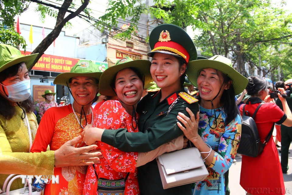 Phụ nữ tham gia ngày càng hiệu quả vào lĩnh vực quốc phòng, an ninh, đối ngoại. Trong ảnh: Nữ quân nhân được người thân đến đón tại ga Biên Hòa (Đồng Nai) trong dịp chuẩn bị tập luyện cho Lễ kỷ niệm 50 năm giải phóng miền Nam, thống nhất đất nước. (Ảnh: Lê Xuân/TTXVN)