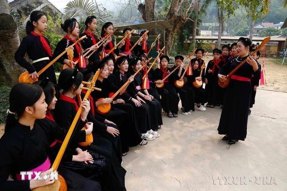 Cô giáo Nguyễn Thị Túc, Chủ nhiệm Câu lạc bộ hát Then trường Phổ thông Dân tộc Nội trú Trung học cơ sở và Trung học Phổ thông Na Hang cùng các em tập luyện nhằm gìn giữ và lan tỏa làn điệu Then trong trường học. (Ảnh: Nam Sương/TTXVN)