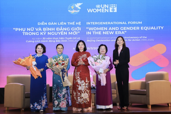 Ủy viên TƯ Đảng, Phó Chủ tịch UBTƯ MTTQ Việt Nam, Chủ tịch Hội LHPN Việt Nam (giữa) cùng các đại biểu tham dự Diễn đàn Liên thế hệ Phụ nữ và Bình đẳng giới trong kỷ nguyên mới