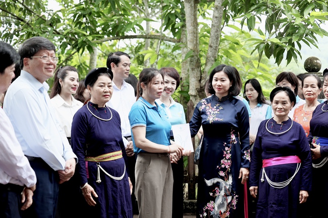 Ủy viên TƯ Đảng, Phó Chủ tịch UBTƯ MTTQ Việt Nam, Chủ tịch Hội LHPN Việt Nam Nguyễn Thị Tuyến (thứ 2 từ phải sang) trò chuyện với cán bộ, hội viên, phụ nữ tại xã Tân Trào, tỉnh Tuyên Quang. Ảnh: Thu Hà