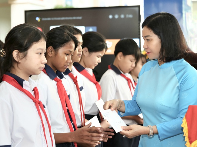 Ủy viên TƯ Đảng, Phó Chủ tịch UBTƯ MTTQ Việt Nam, Chủ tịch Hội LHPNViệt Nam Nguyễn Thị Tuyến (bìa phải) trao quà cho học sinh có hoàn cảnhkhó khăn tại trường THCS Thạnh Mỹ (tỉnh Lâm Đồng). Ảnh: Thu Hà