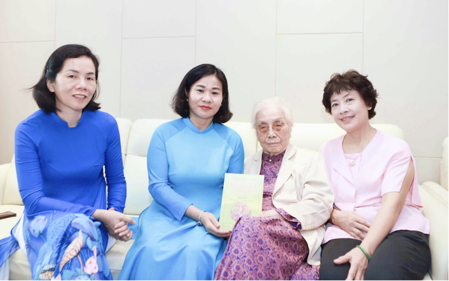 Ủy viên Trung ương Đảng, Phó Chủ tịch Ủy ban Trung ương MTTQ Việt Nam, Chủ tịch Hội LHPN Việt Nam Nguyễn Thị Tuyến (thứ 2 từ trái sang) và Phó Chủ tịch Hội LHPN Việt Nam Nguyễn Thị Minh Hương (bìa trái) tặng sách nguyên Phó Chủ tịch nước Nguyễn Thị Bình (thứ 2 từ phải sang), tháng 8/2025 - Ảnh: PV
