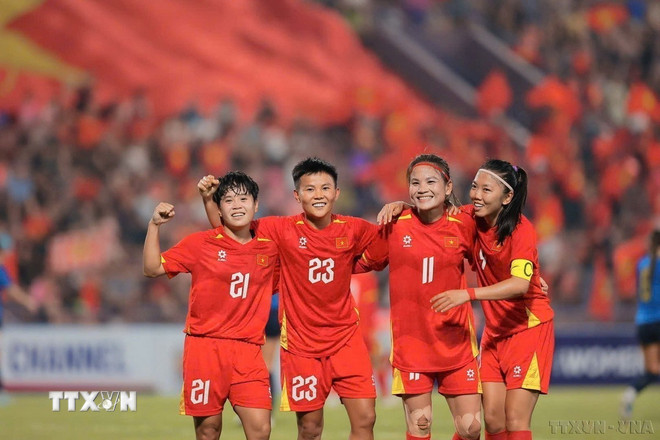 Đội tuyển bóng đã nữ Việt Nam xuất sắc giành chiến thắng trước Đội tuyển Guam, chính thức góp mặt tại Vòng chung kết Giải Bóng đá nữ châu Á. (Ảnh: Phạm Tuấn Anh/TTXVN)