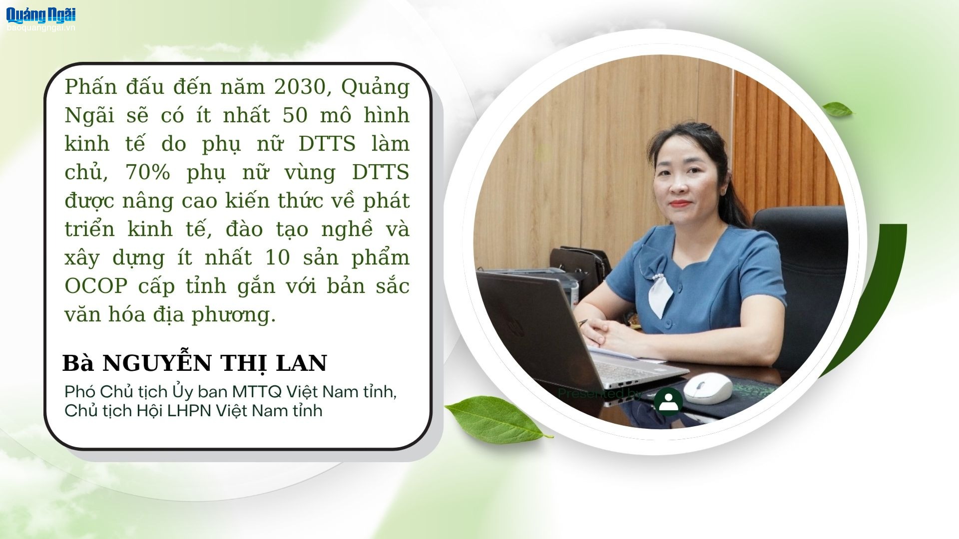 Phấn đấu đến năm 2030, Quảng Ngãi sẽ có ít nhất 50 mô hình kinh tế do phụ nữ DTTS làm chủ, 70% phụ nữ vùng DTTS được nâng cao kiến thức về phát triển kinh tế, đào tạo nghề và xây dựng ít nhất 10 sản phẩm OCOP cấp tỉnh gắn với bản sắc văn hóa địa phương.