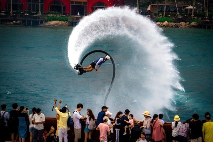 Du khách theo dõi trình diễn ván bay nước tại Phú Quốc. Ảnh: Bùi Văn Hải