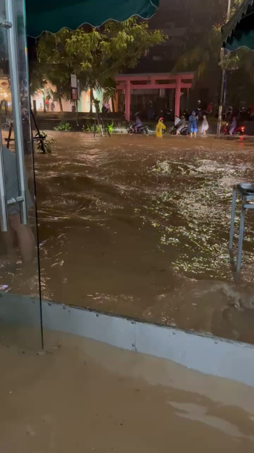 Chia sẻ với Tri Thức - Znews, anh Minh Hiếu (31 tuổi, nhân viên khách sạn) cho biết từ khoảng hơn 20h tối 29/10, trời bắt đầu mưa to. Trên đường đi làm, anh chạy qua trục đường Trần Hưng Đạo thì thấy ngập sâu, xe cộ ùn tắc, nhiều ôtô lớn bị kẹt lại. Anh quyết định rẽ vào hẻm nhỏ ven biển để tránh, nhưng vì trời tối, không có đèn nên không nhìn thấy dòng nước đang chảy xiết.