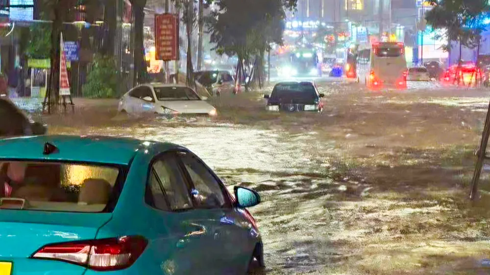 Mưa lớn làm nhiều tuyến đường tại trung tâm đặc khu ngập sâu. Ảnh: DD