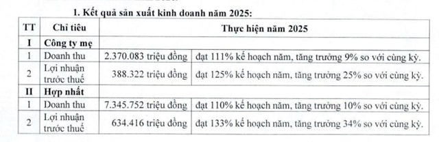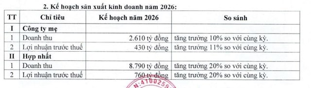 Riêng với Công ty mẹ, mục tiêu được đề ra là 2.610 tỷ đồng doanh thu và 430 tỷ đồng lãi trước thuế, lần lượt tăng 10% và 11% so với năm 2025.