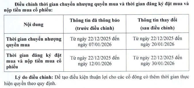 Theo đó, thời gian chuyển nhượng quyền mua từ 22/12/2025 - 07/01/2026 sẽ được nới đến ngày 20/01/2026, trong khi thời gian đăng ký đặt mua và nộp tiền mua từ 22/12/2025 - 12/01/2026 được kéo dài đến 30/01/2026. Lý do điều chỉnh nhằm tạo điều kiện thuận lợi cho các cổ đông có thêm thời gian thực hiện quyền.
