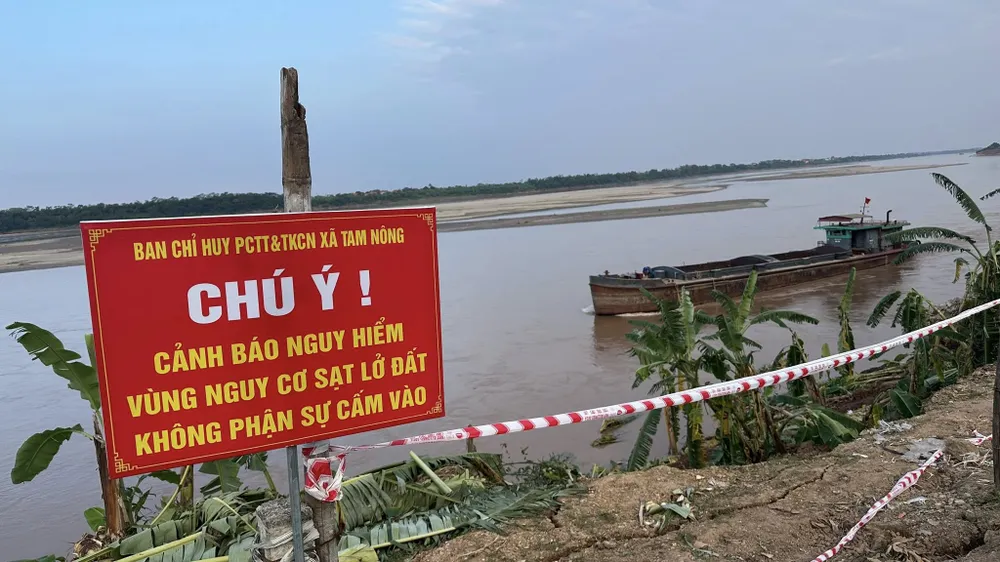 Chính quyền địa phương cắm biển cảnh báo nguy hiểm tại khu vực sạt lở bờ sông Thao đoạn qua xã Tam Nông. Ảnh: PV
