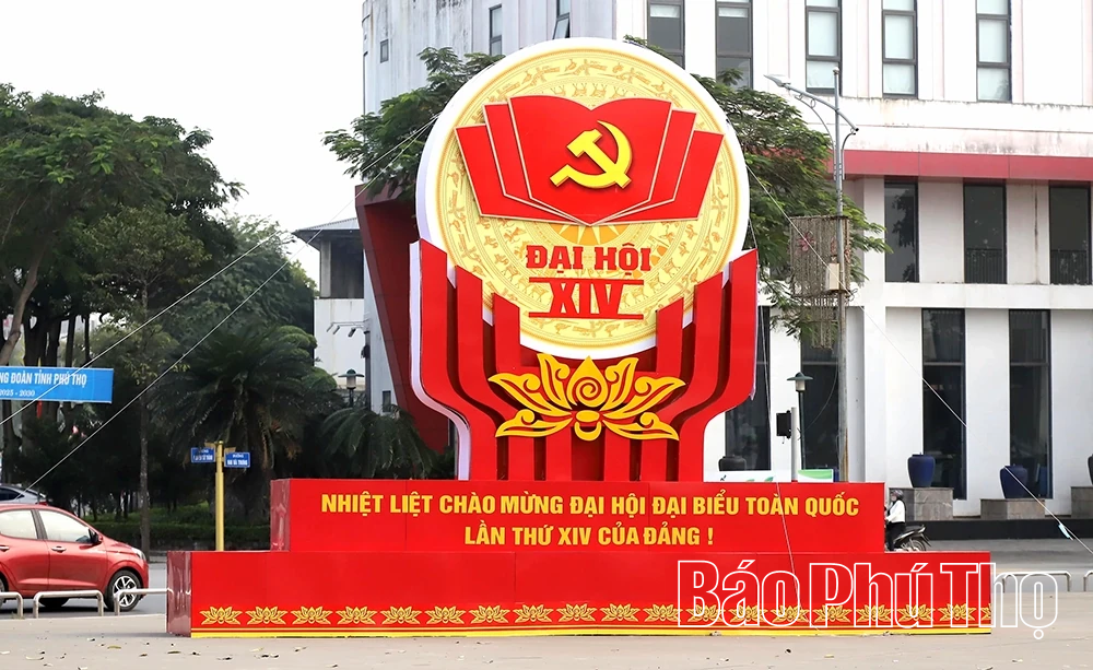 Các cụm pano, áp phích với những thông điệp ý nghĩa chào mừng Đại hội được đặt tại Quảng trường Hùng Vương, phường Việt Trì.
