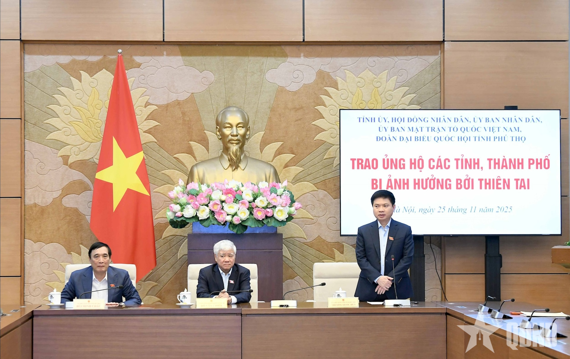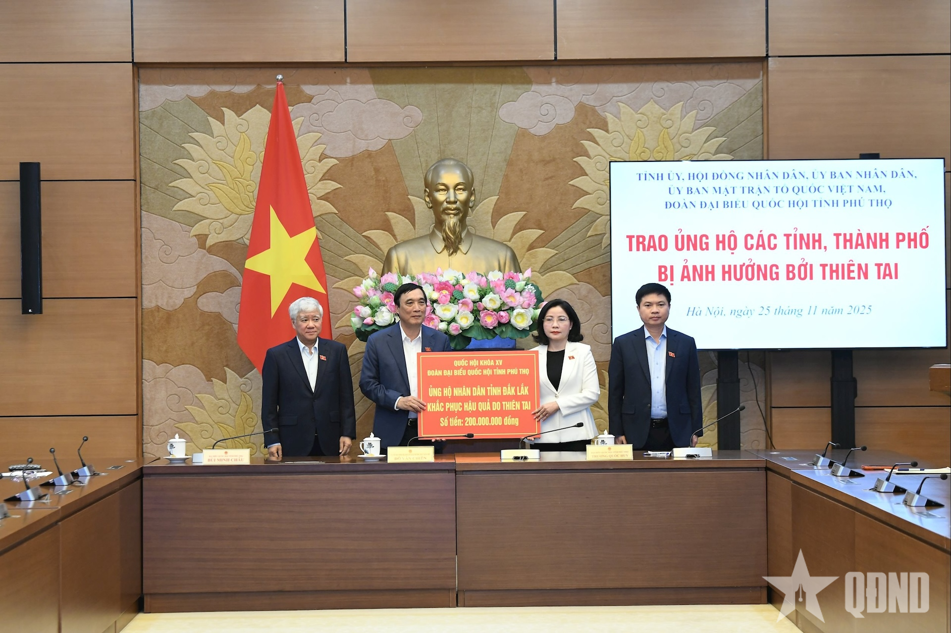 Phó chủ tịch Thường trực Quốc hội Đỗ Văn Chiến chứng kiến đoàn đại biểu Quốc hội tỉnh Phú Thọ trao 200 triệu đồng hỗ trợ nhân dân tỉnh Đắk Lắk khắc phục hậu quả thiên tai. Ảnh: LÂM HIỂN