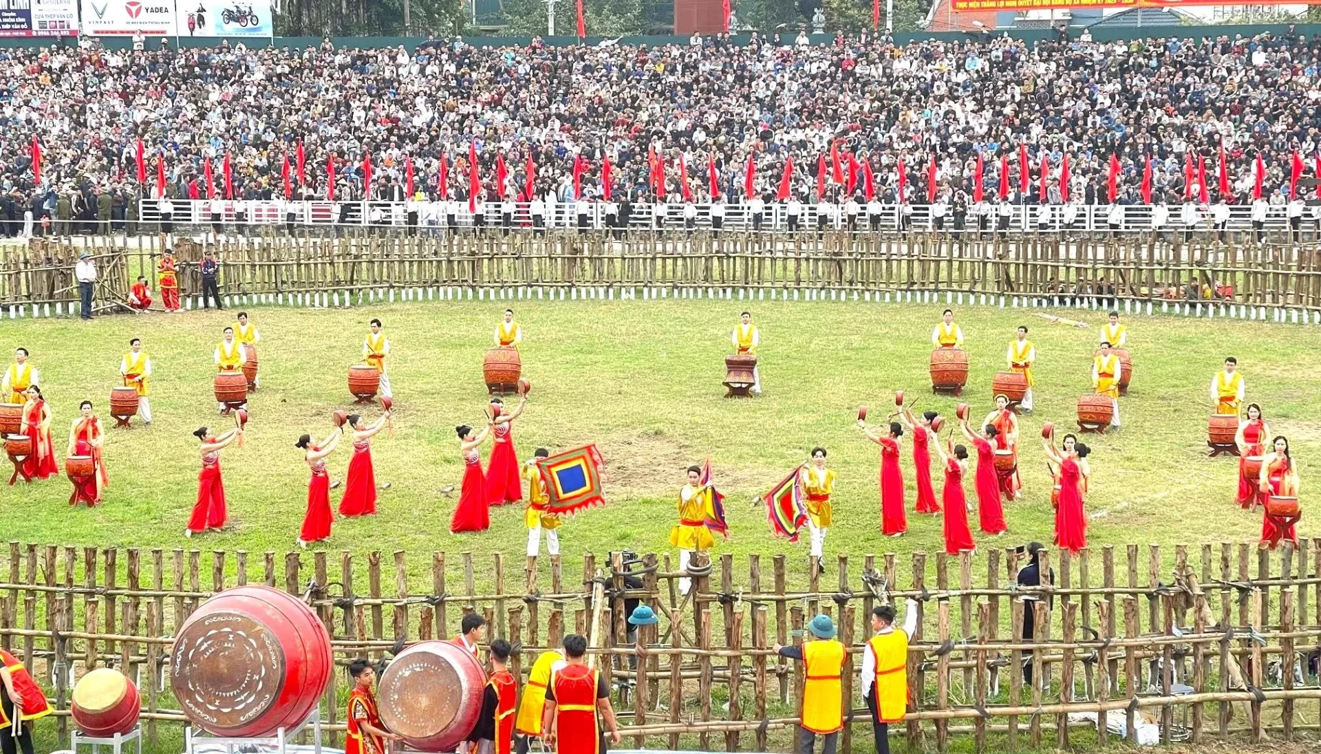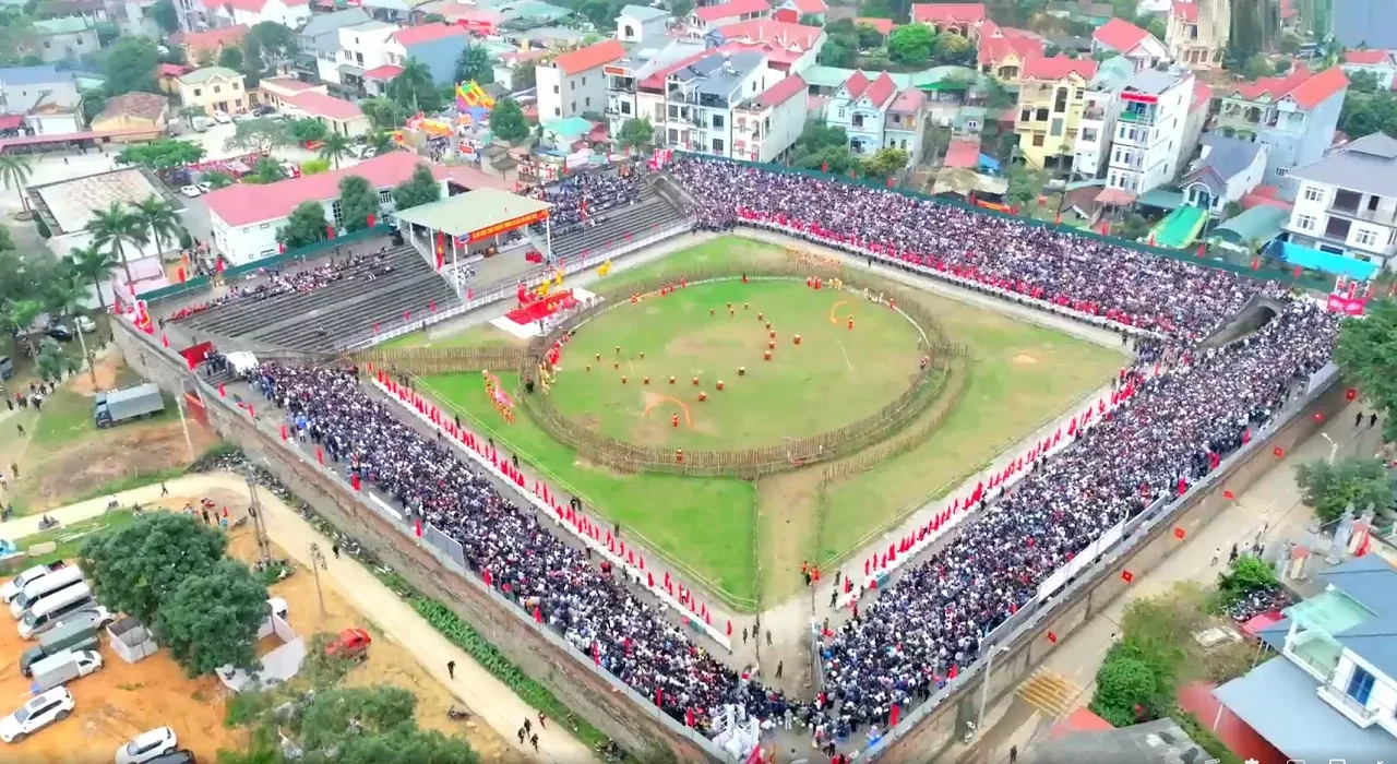 Toàn cảnh không gian lễ hội chọi trâu Hải Lựu (tỉnh Phú Thọ) nhìn từ trên cao – một sinh hoạt văn hóa cộng đồng được gìn giữ qua nhiều thế hệ. Ảnh: Phúc An