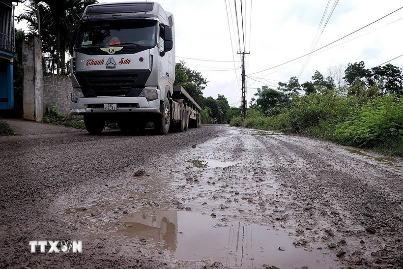 Tuyến đường liên xã tại Phú Thọ bị xuống cấp nghiêm trọng do các xe ôtô tải trọng lớn chạy thường xuyên. (Ảnh: Thanh Hải/TTXVN)