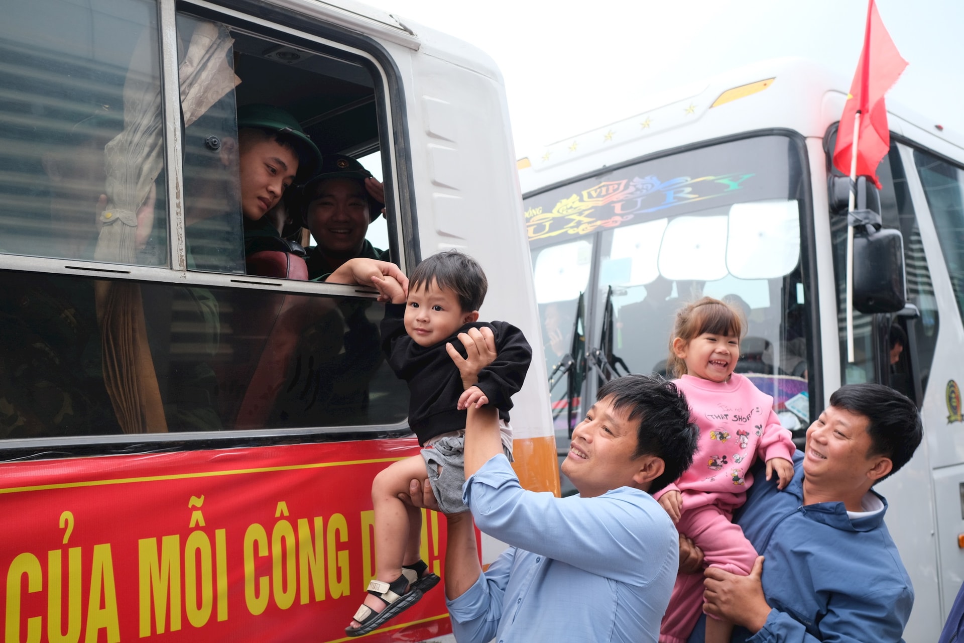 Người thân bế em nhỏ chia tay tân binh lên đường nhận nhiệm vụ - hình ảnh xúc động tại lễ giao nhận quân 2026. Ảnh: Sỹ Hào