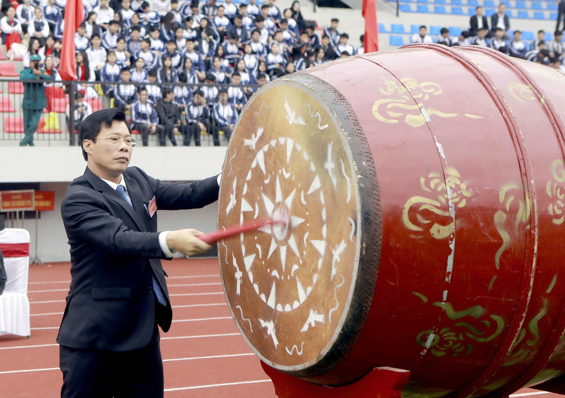 Chủ tịch UBND phường Vĩnh Phúc Nguyễn Hoài Nam nổi hồi trống mở hội giao quân năm 2026. Ảnh: Sỹ Hào
